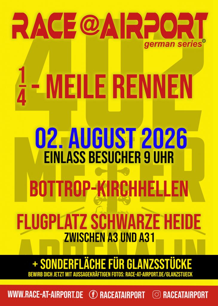 Race@Airport: 3. August 2025 Sehr geehrte Damen und Herren, wir freuen uns Ihnen mitteilen zu können, dass am 3. August 2025 um 09:00 Uhr das Race@Airport wieder am Flugplatz Schwarze-Heide stattfinden wird. Voraussichtlicher zeitlicher Ablauf: Einlass (Fahrer): 08:00 Uhr Einlass (Besucher): 09:00 Uhr Fahrerbesprechung: 10:00 Uhr Start: 10:30 Uhr Siegerehrung: 17:00 Uhr Karten können Sie […]